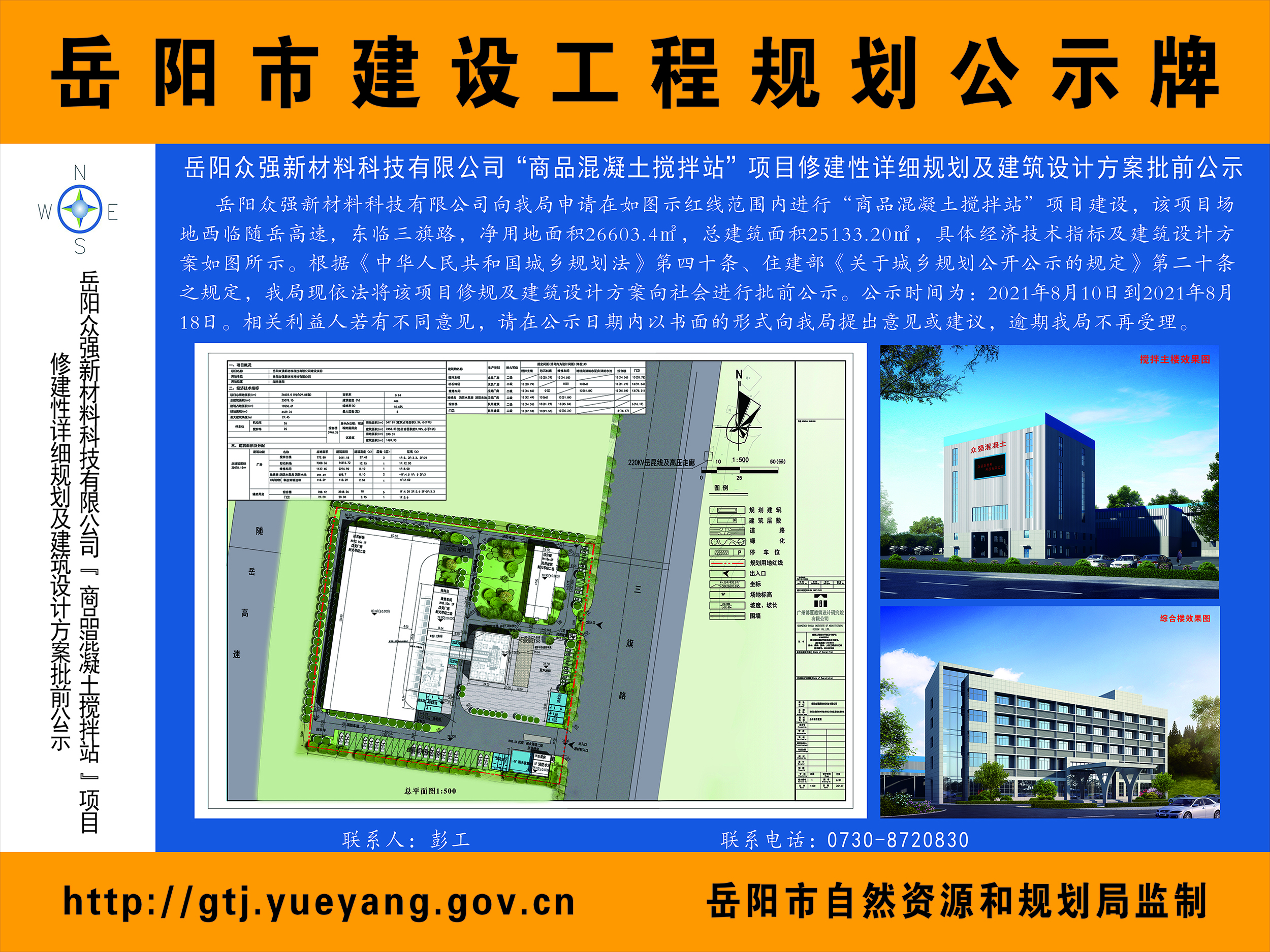 岳阳众强新材料科技有限公司“商品混凝土搅拌站”项目修建性详细规划及建筑设计方案批前公示