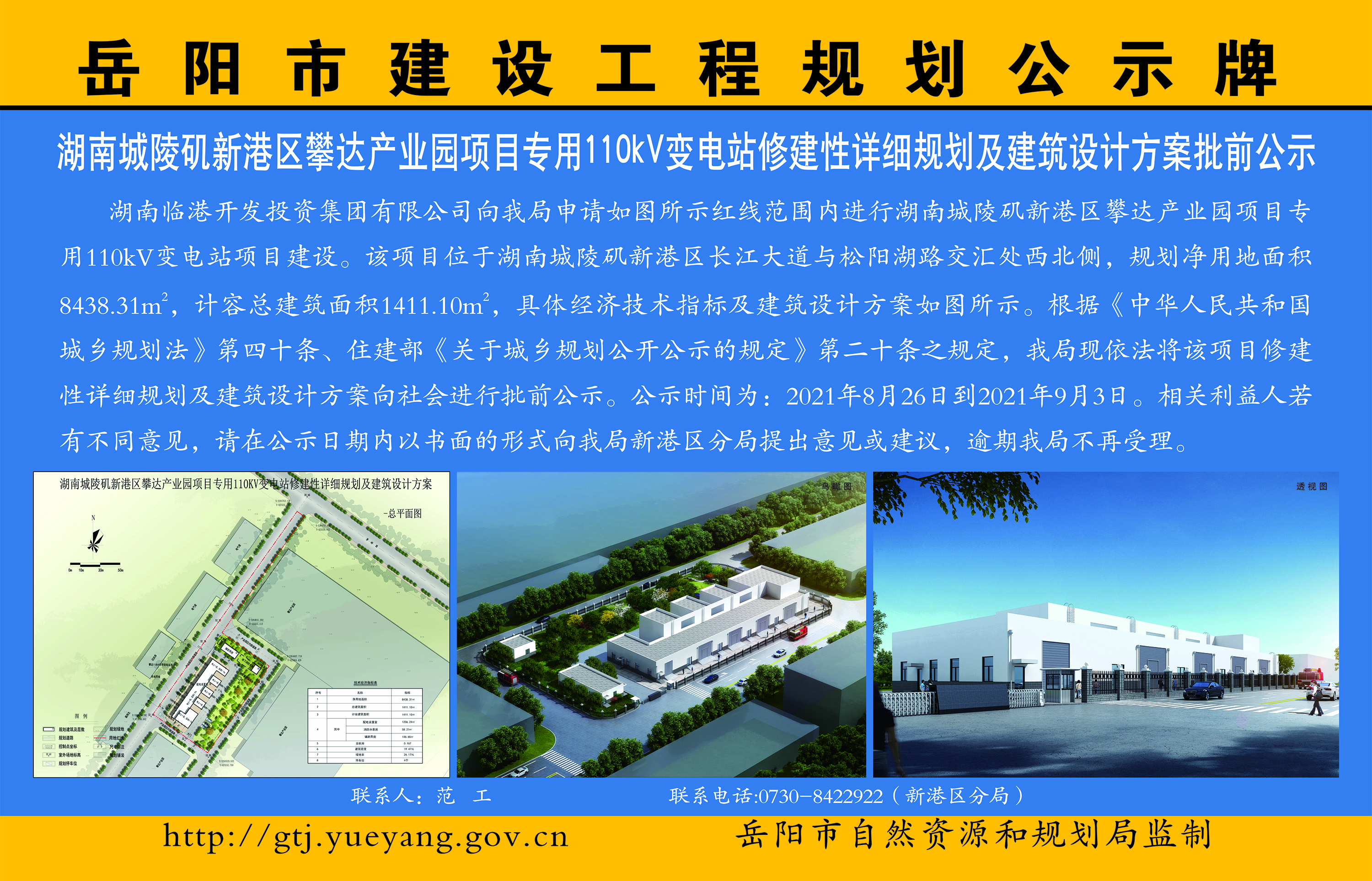 湖南城陵矶新港区攀达产业园项目专用110kV变电站修建性详细规划及建筑设计方案批前公示