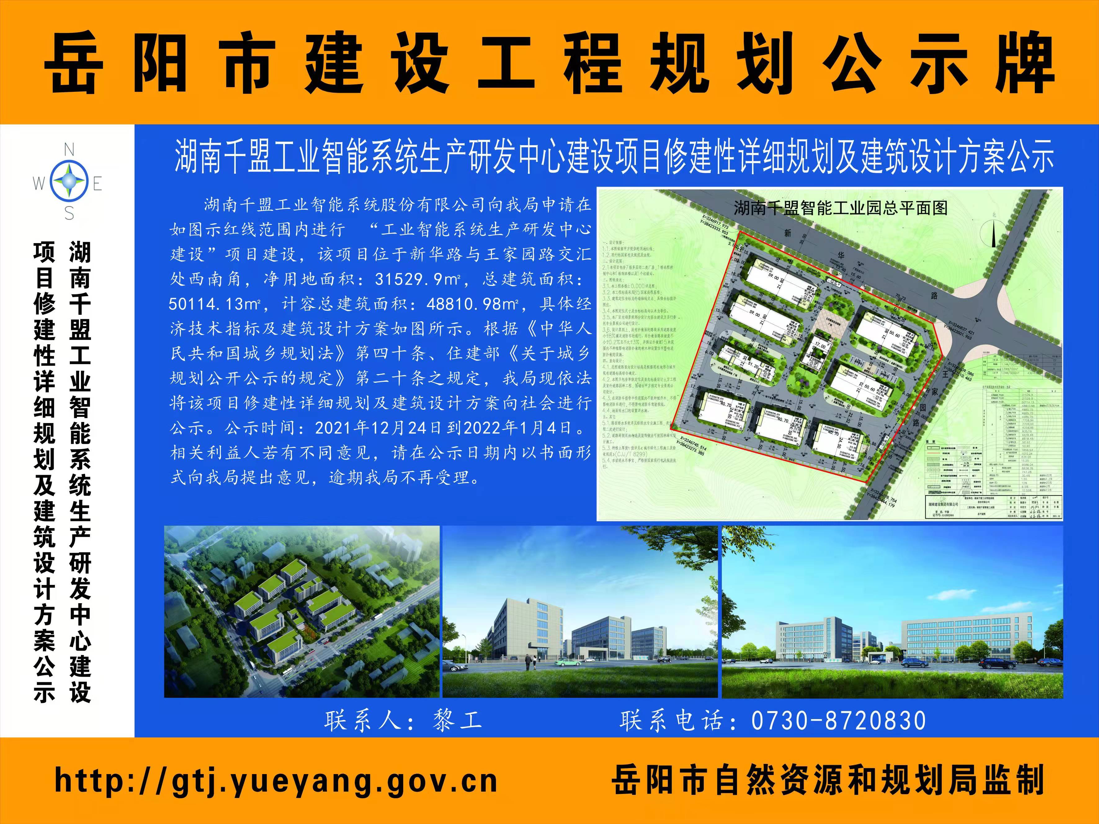 湖南千盟工业智能系统生产研发中心建设项目修建性详细规划及建筑方案批前公示