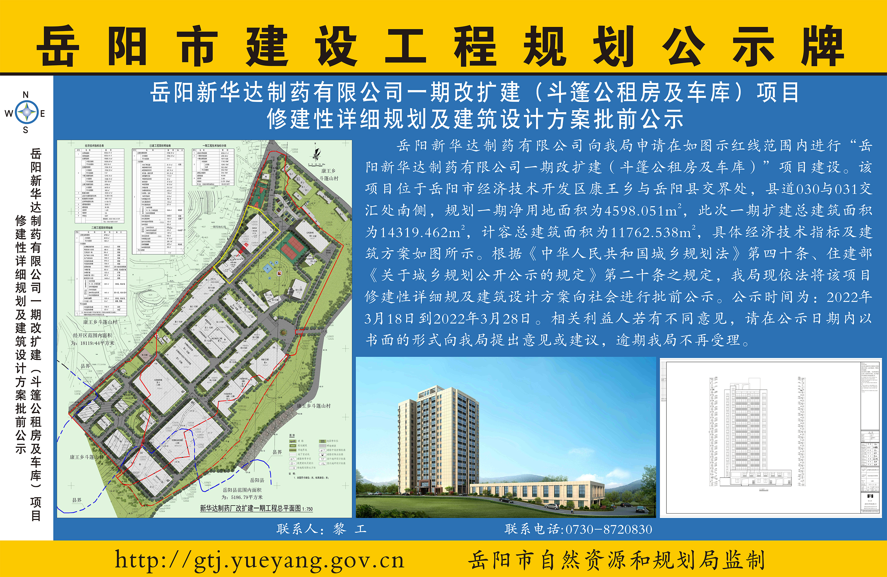 岳阳新华达制药有限公司一期改扩建(斗篷公租房及车库)项目修建性详细规划及建筑设计方案批前公示