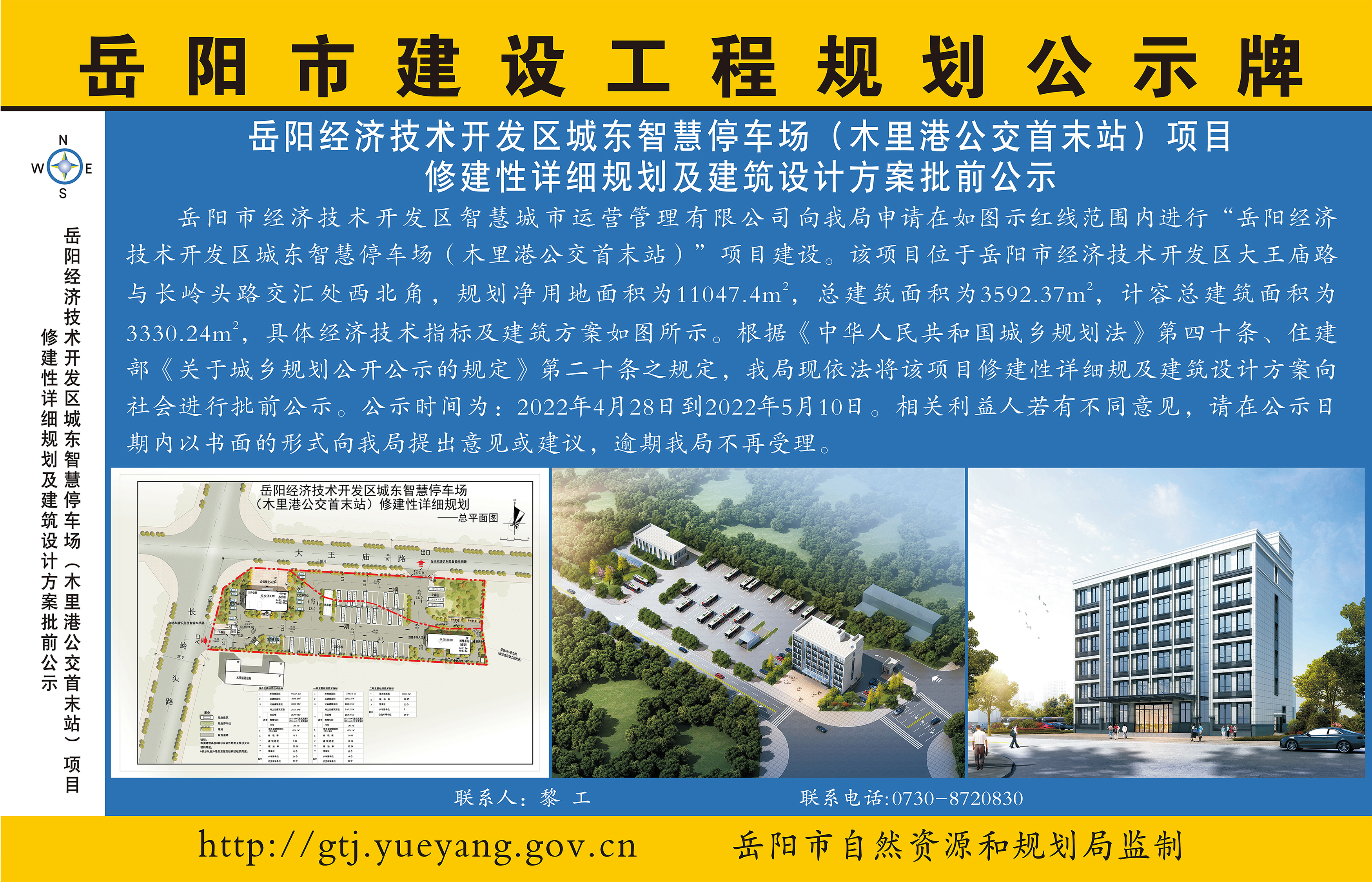 岳阳经济技术开发区城东智慧停车场(木里港公交首末站)项目修建性详细规划及建筑设计方案批前公示