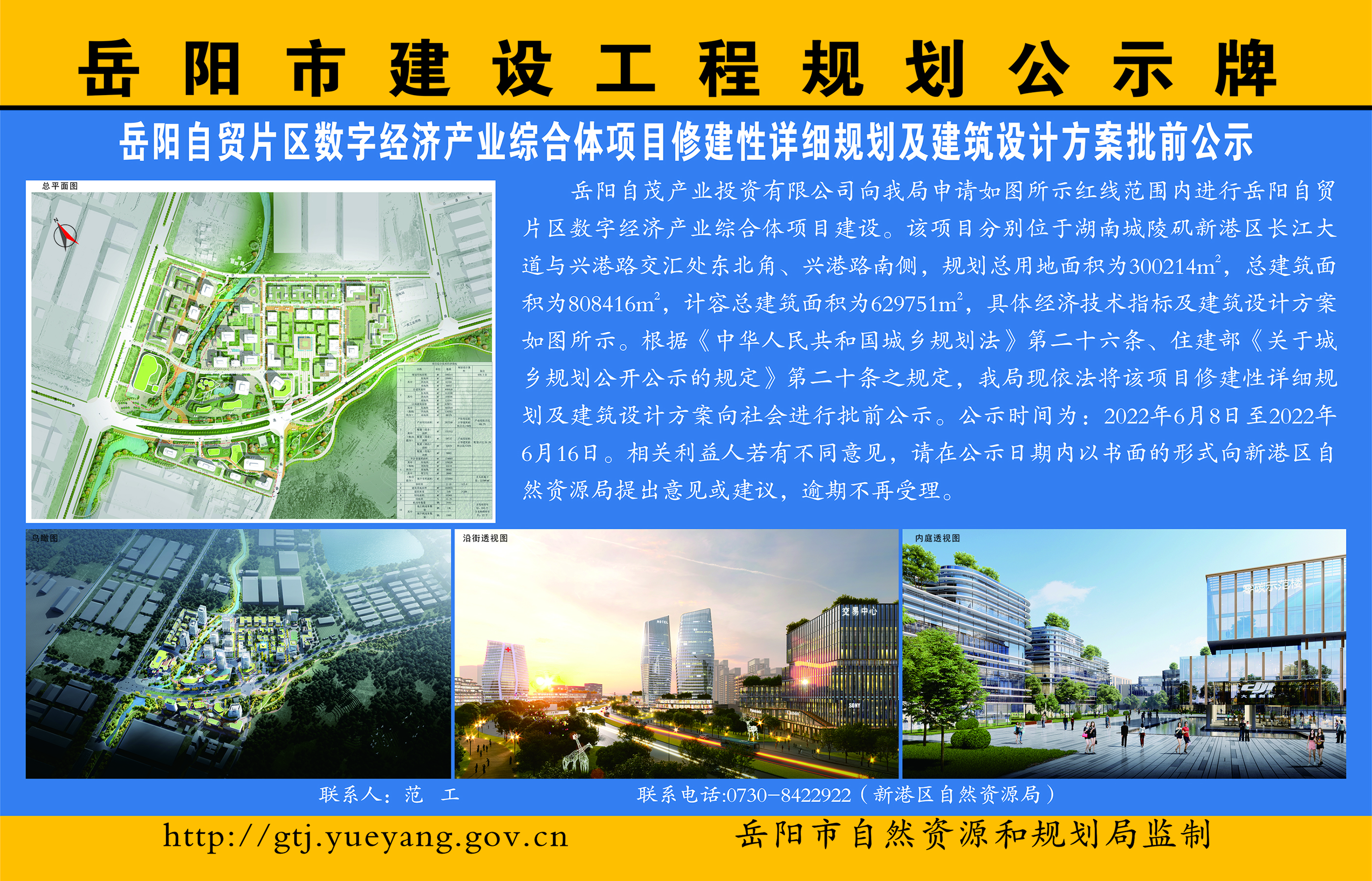 岳阳自茂产业投资有限公司岳阳自贸片区数字经济产业综合体建设项目修建性详细规划及建筑设计方案批前公示