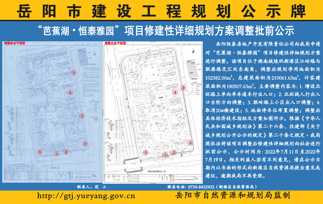 岳阳恒泰房地产开发有限责任公司“芭蕉湖·恒泰雅园项目”修建性详细规划方案调整批前公示