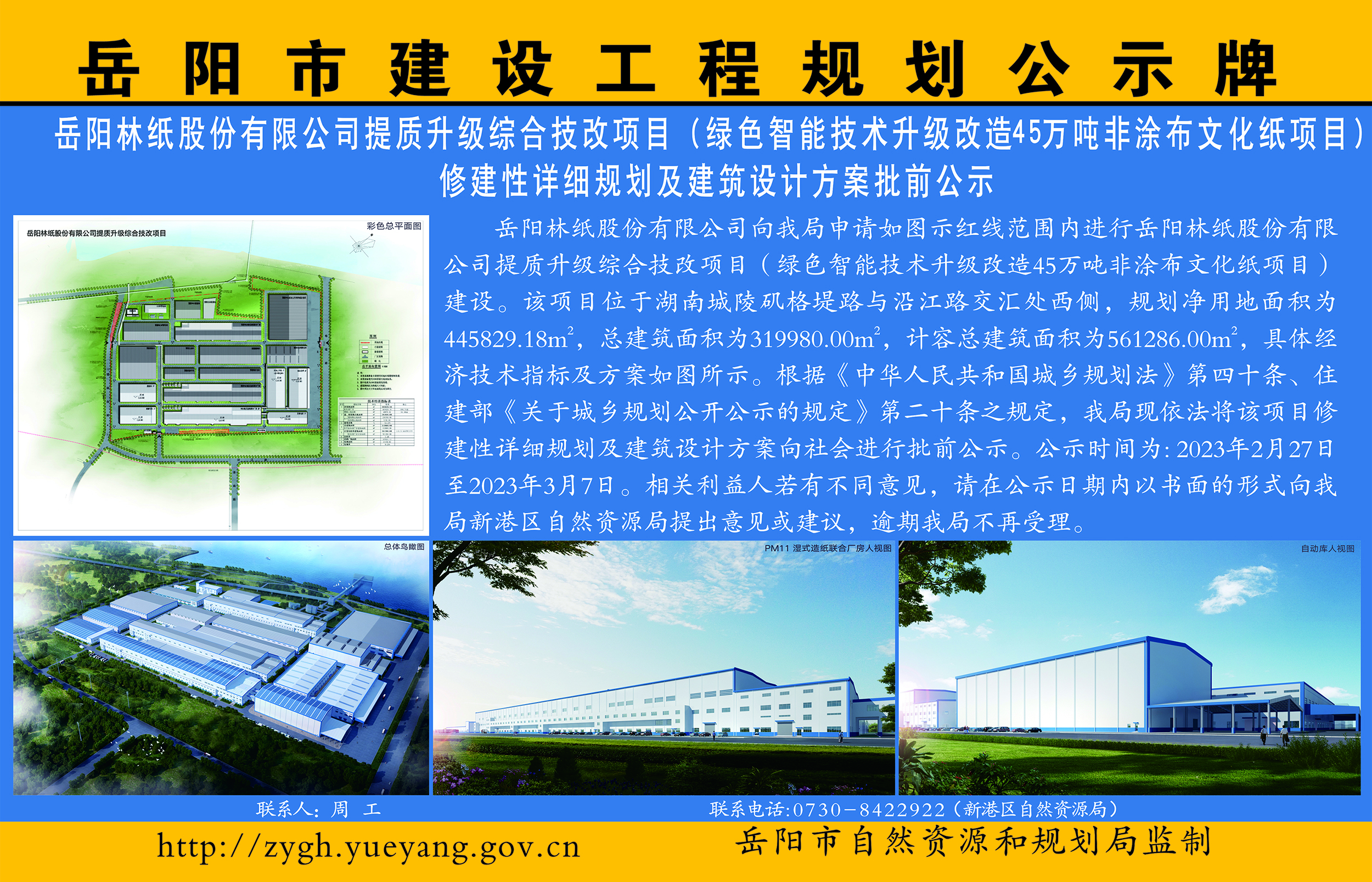 岳阳林纸股份有限公司提质升级综合技改项目(绿色智能技术升级改造45万吨非涂布文化纸项目)修建性详细规划及建筑设计方案批前公示