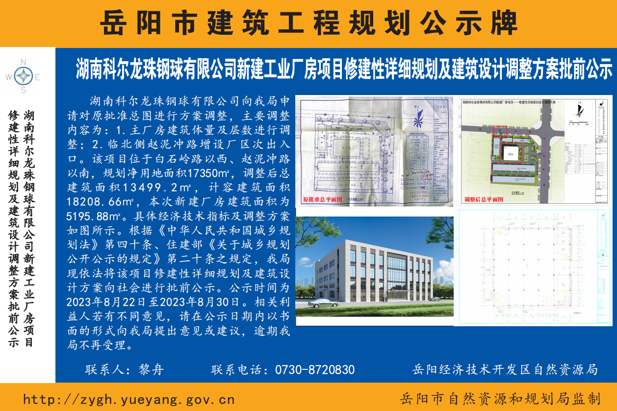 湖南科尔龙珠钢球有限公司新建工业厂房项目修建性详细规划及建筑设计调整方案批前公示