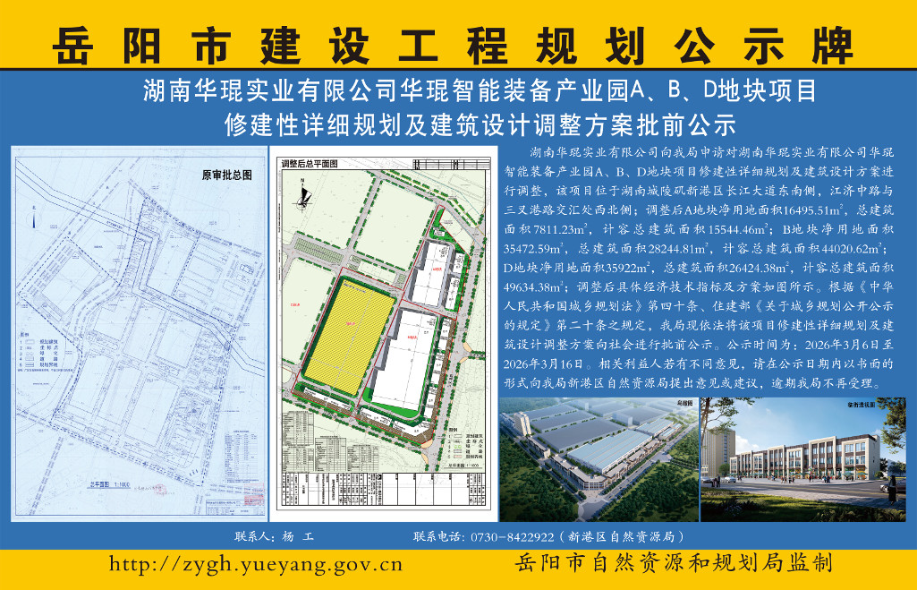 湖南华琨实业有限公司华琨智能装备产业园A、B、D地块项目修建性详细规划及建筑设计调整方案批前公示