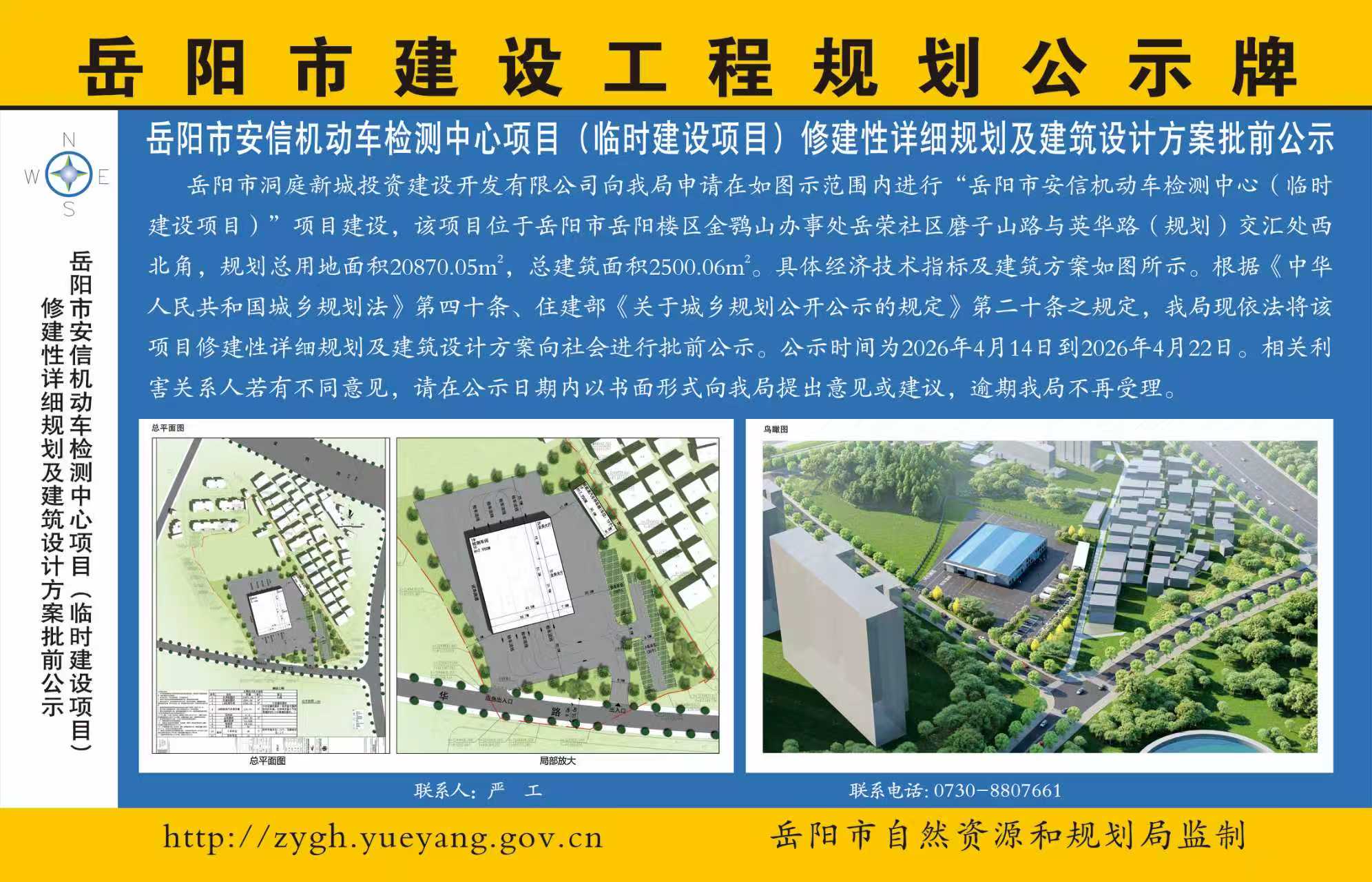 岳阳市安信机动车检查中心项目(临时建设项目)修建性详细规划及建筑设计方案批前公示