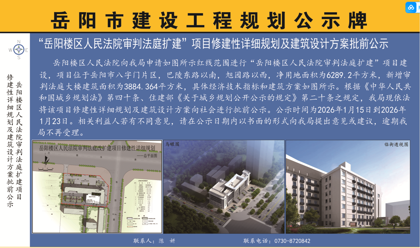 岳阳楼区人民法院审判法庭扩建项目修建性详细规划及建筑设计方案批前公示