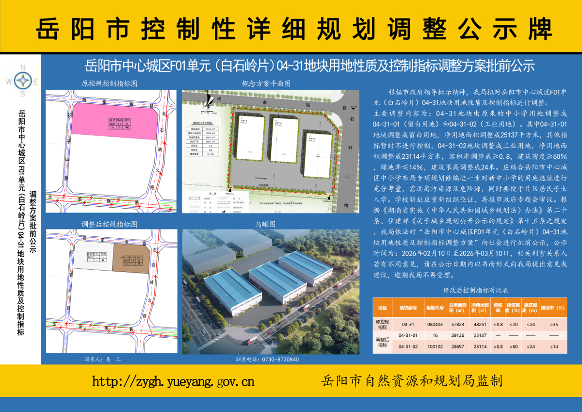 岳阳市中心城区F01单元(白石岭片)04-31地块用地性质及控制指标调整方案批前公示