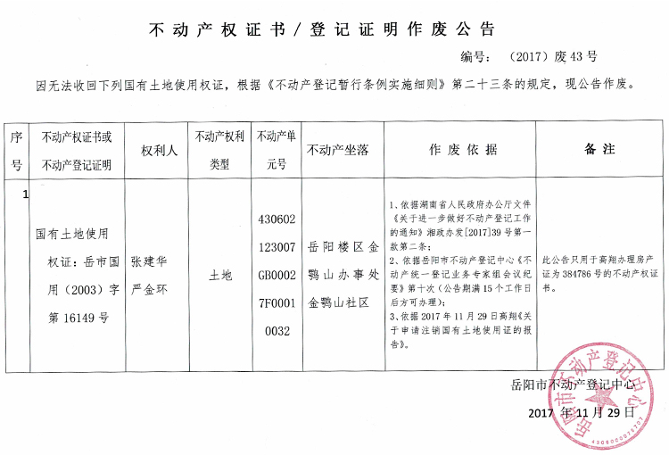 不动产权证书/登记证明作废公告 编号:(2017)废43号