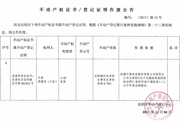 不动产权证书/登记证明作废公告 编号:(2017)废44号