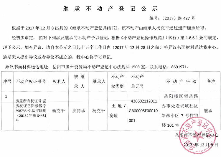 继承不动产登记公示 编号:(2017)继437号
