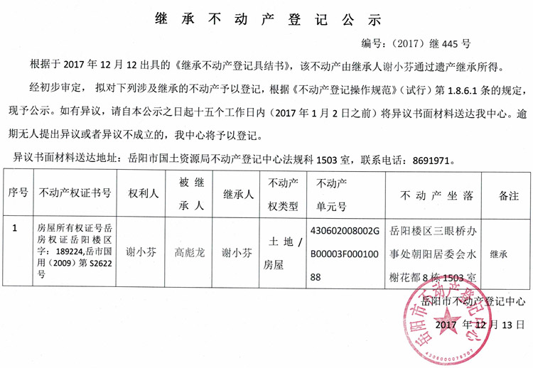 继承不动产登记公示 编号:(2017)继445号