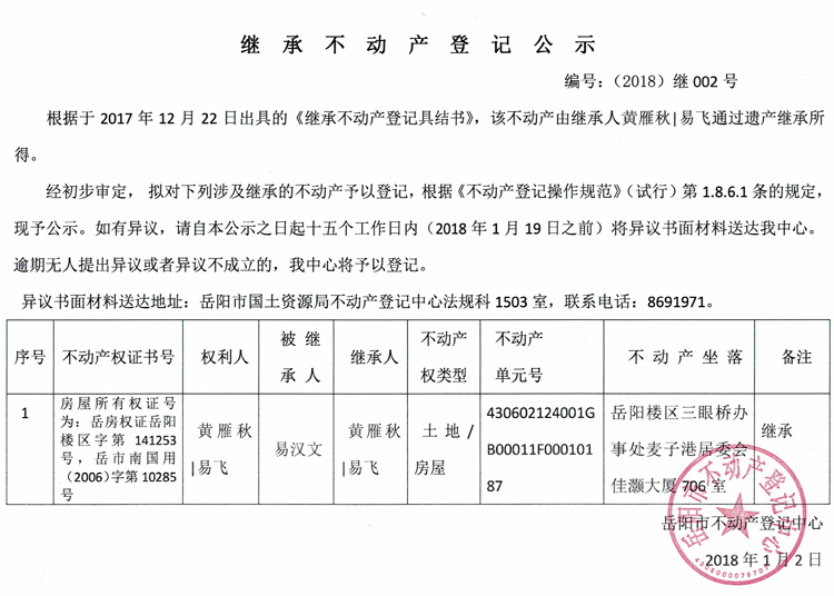 继承不动产登记公示 编号:(2018)继002号