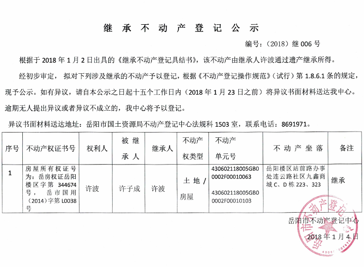 继承不动产登记公示 编号:(2018)继006号