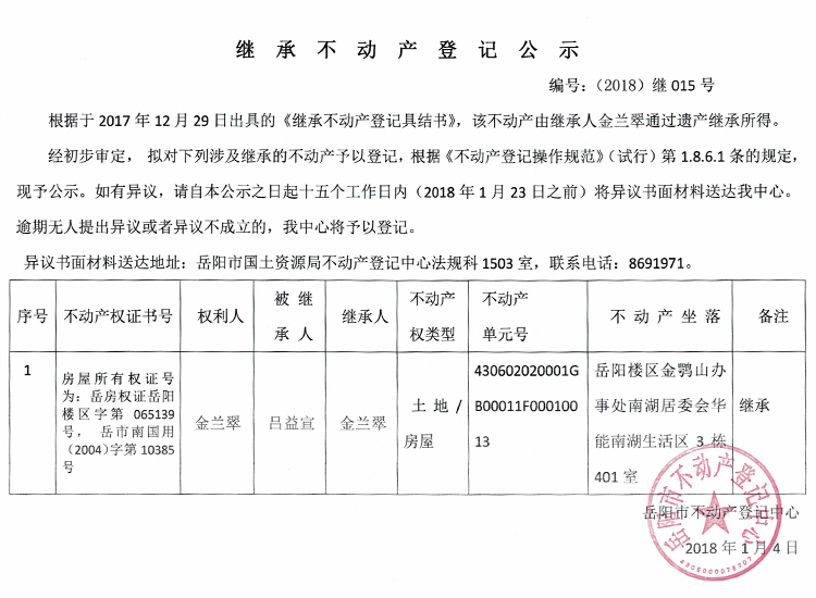 继承不动产登记公示 编号:(2018)继015号