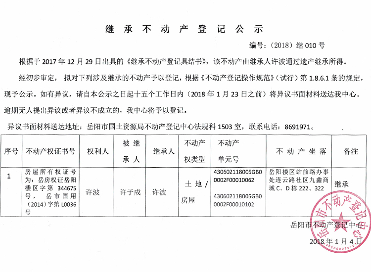 继承不动产登记公示 编号:(2018)继010号