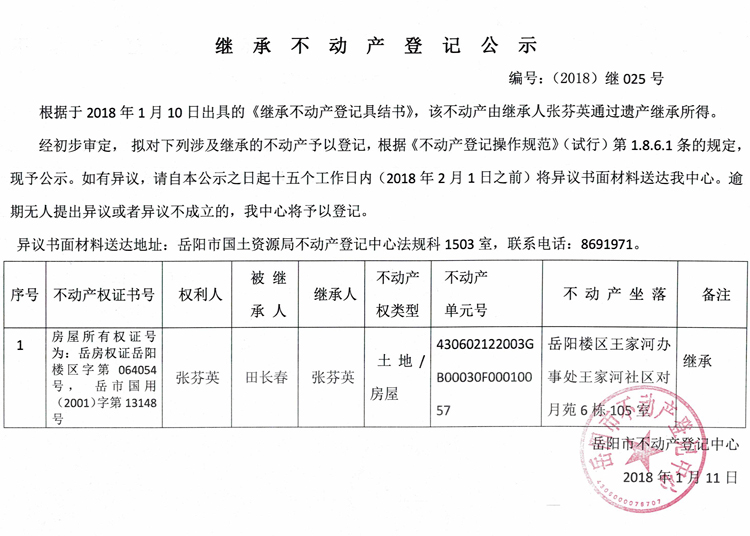 继承不动产登记公示 编号:(2018)继025号