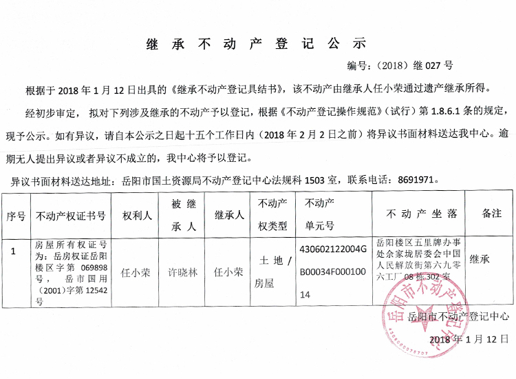 继承不动产登记公示 编号:(2018)继027号