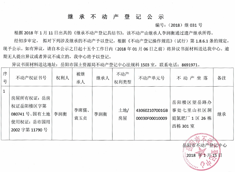 继承不动产登记公示 编号:(2018)继031号