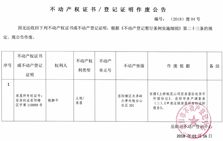 不动产权证书/登记证明作废公告 编号:(2018)废04号
