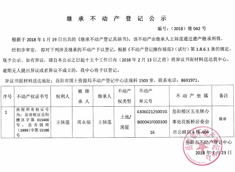 继承不动产登记公示 编号:(2018)继042号