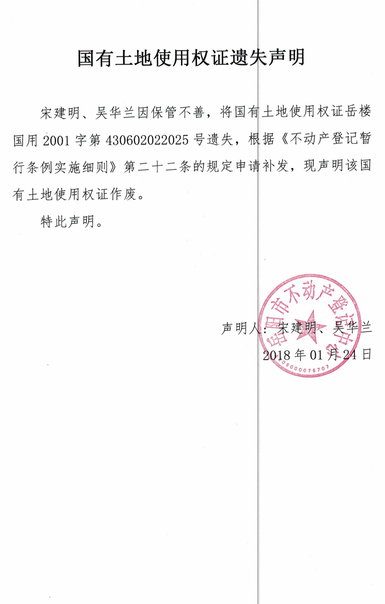 国有土地使用权证遗失声明(宋建明、吴华兰)