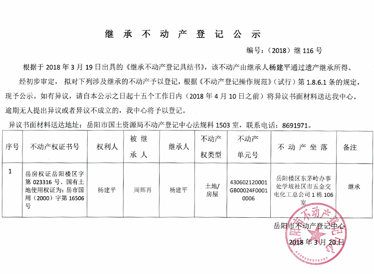 继承不动产登记公示 编号:(2018)继116号
