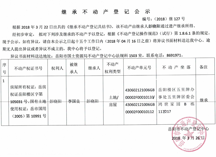 继承不动产登记公示 编号:(2018)继127号