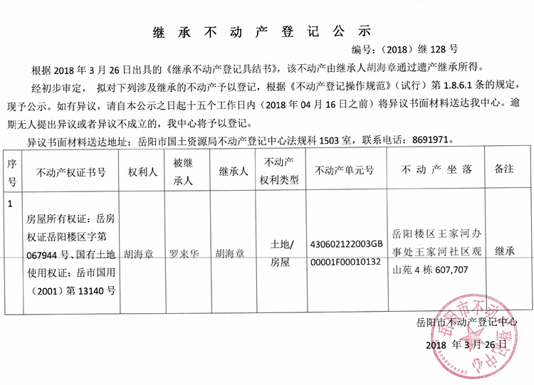 继承不动产登记公示 编号:(2018)继128号