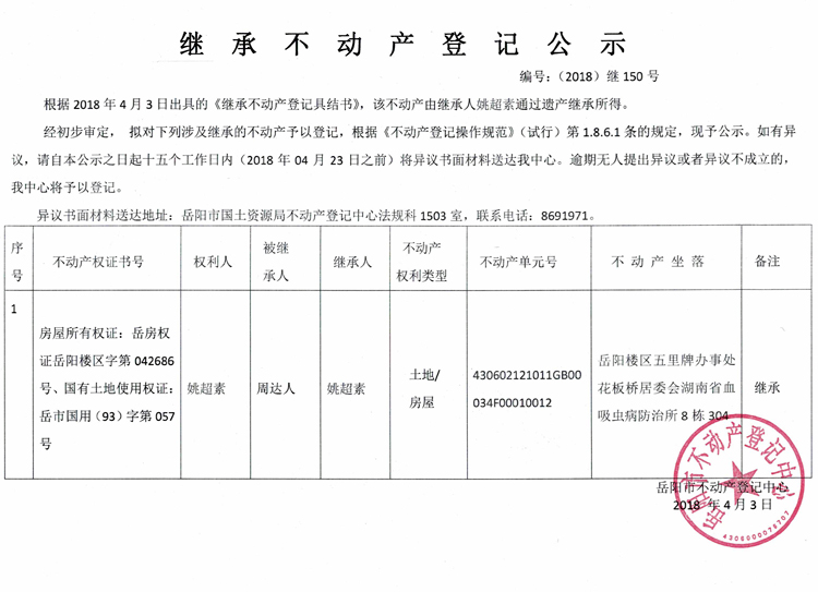 继承不动产登记公示 编号:(2018)继150号