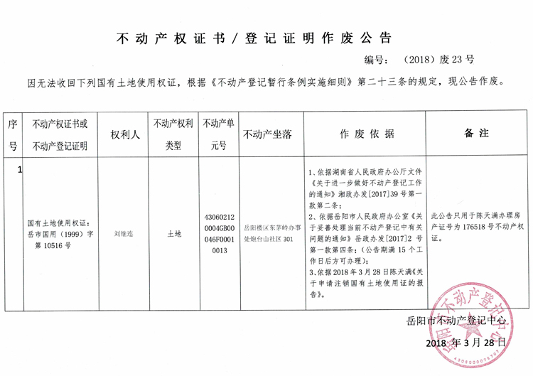 不动产权证书/登记证明作废公告 编号:(2018)废23号