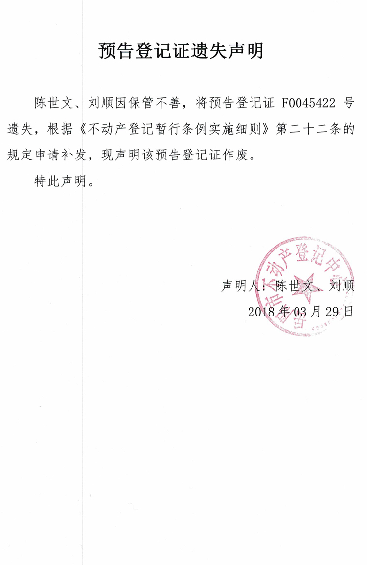 预告登记证遗失声明(陈世文、刘顺)