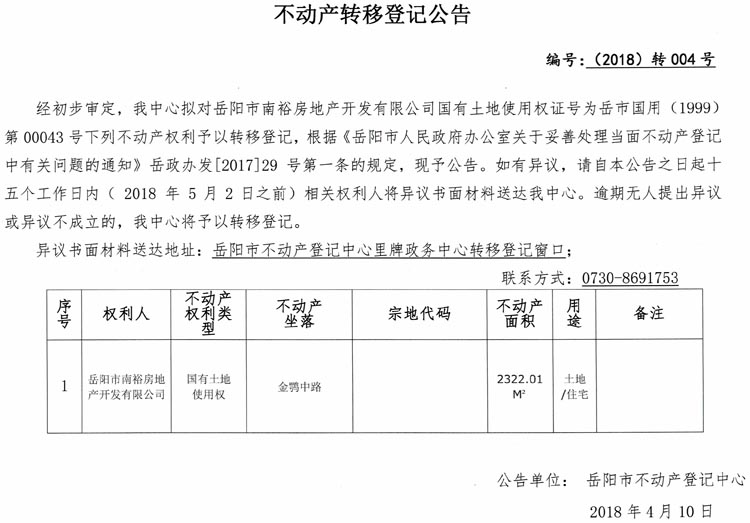 不动产转移登记公告 编号:(2018)转004号