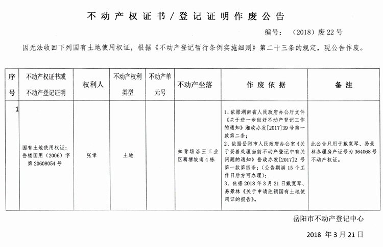 不动产权证书/登记证明作废公告 编号:(2018)废22号