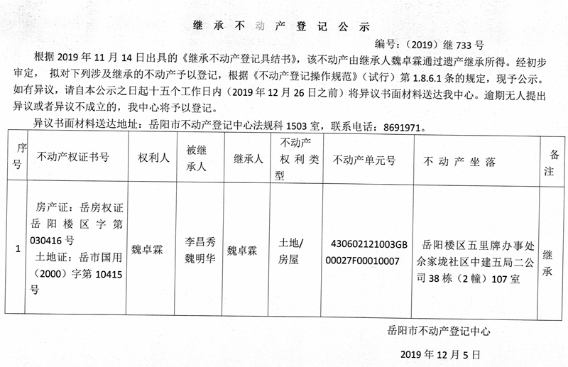 继承不动产登记公示 编号:(2019)继733号(魏卓霖)