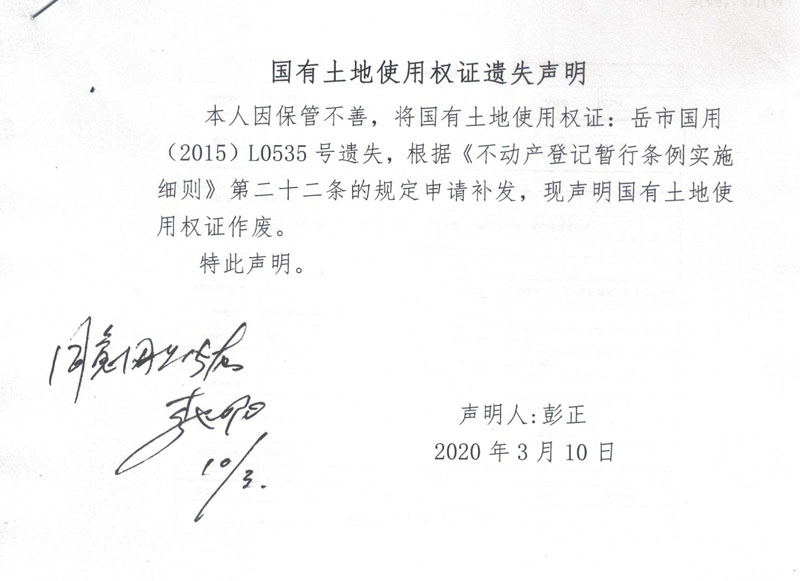 国有土地使用权证遗失声明(彭正,土地证岳市国用(2015)字第L0535号)