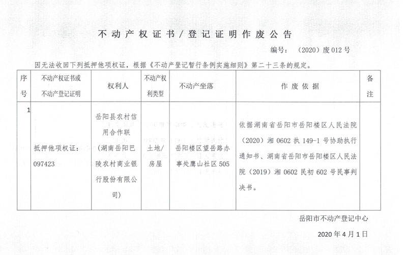 不动产权证书/登记证明作废公告(抵押他项权人:岳阳县农村信用合作联(湖南岳阳巴陵农村商业银行股份有限公司))