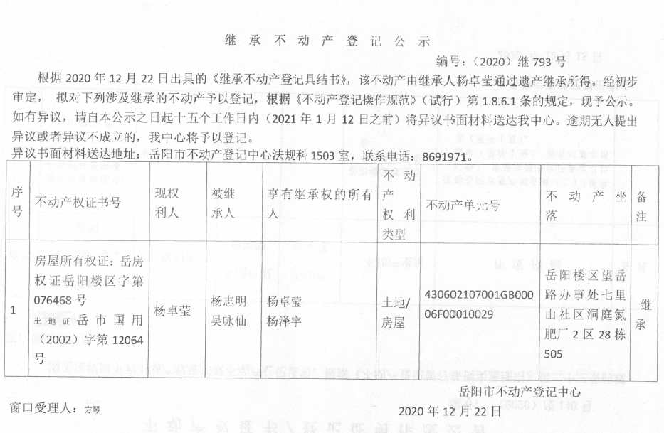 继承不动产登记公示 编号:(2020)继793号(杨卓莹)