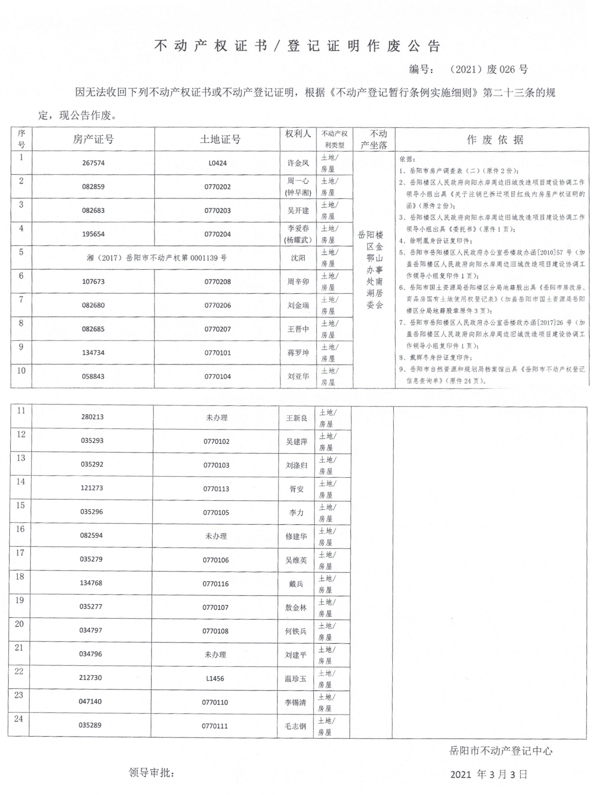 不动产权证书、登记证明作废公告 编号: (2021)废026号(向阳水岸周边旧城改造项目许金凤等24户)