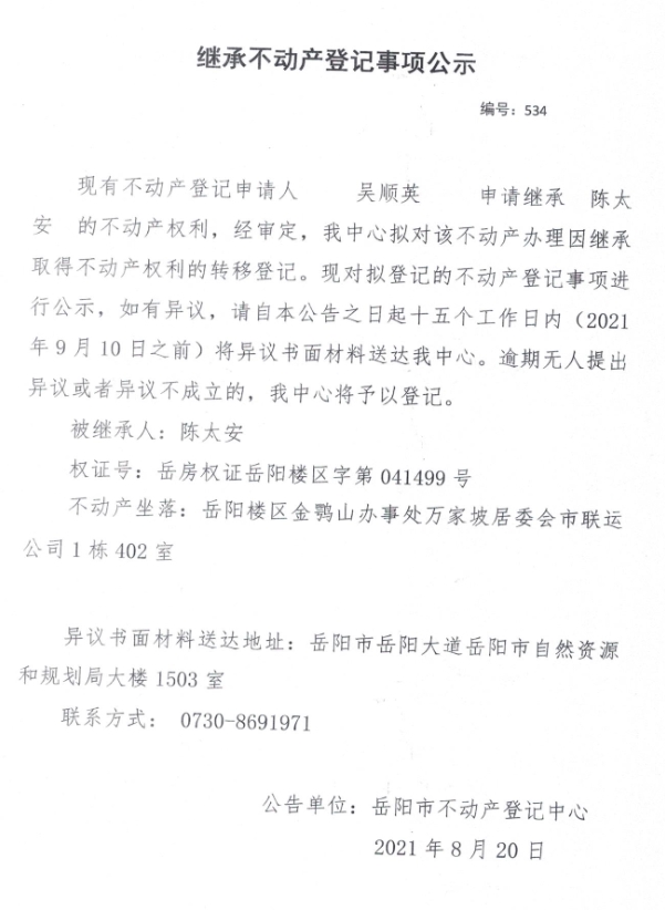 继承不动产登记事项公示(吴顺英)