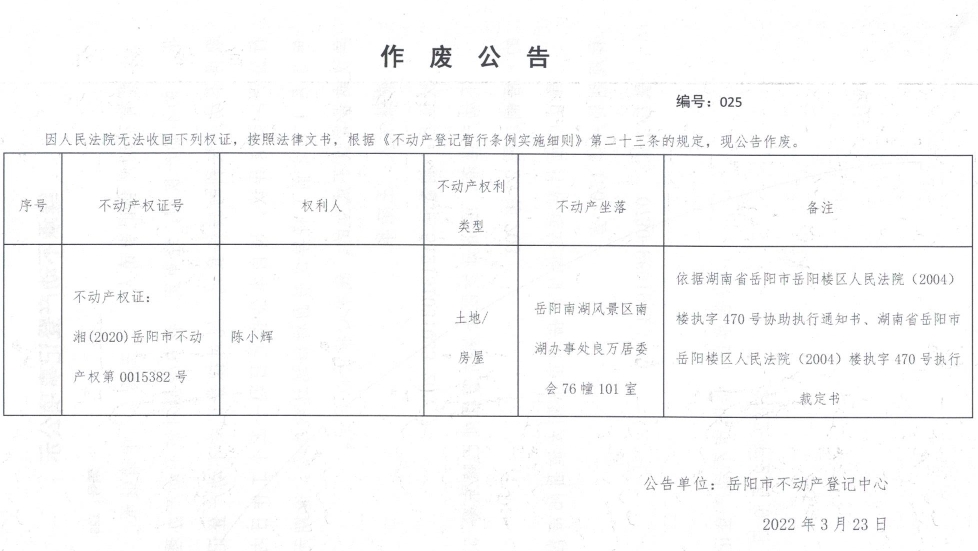 作废公告 编号:25(陈小辉)