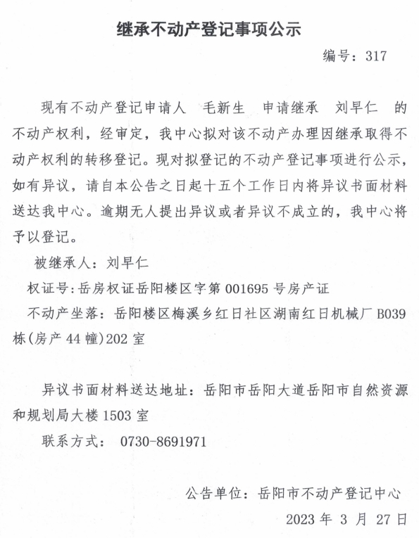 继承不动产登记公示 编号:毛新生(317)