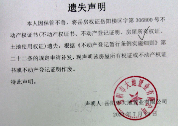 遗失声明(岳阳市大地置业有限公司)