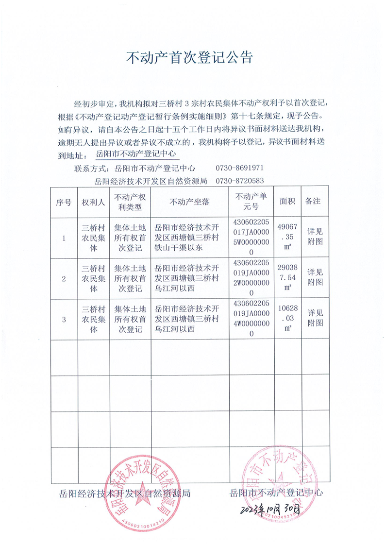 不动产首次登记公告(三桥村)