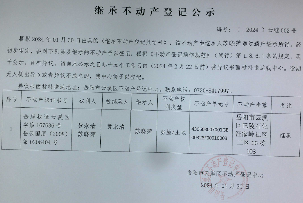 继承不动产公示 编号:(2024)云继002号