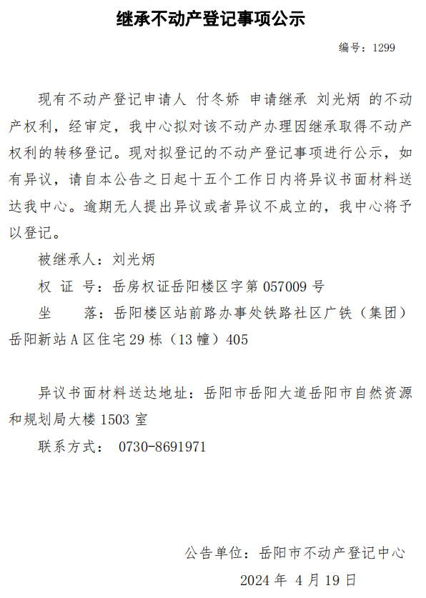 继承不动产登记公示 编号:付冬娇(1299)