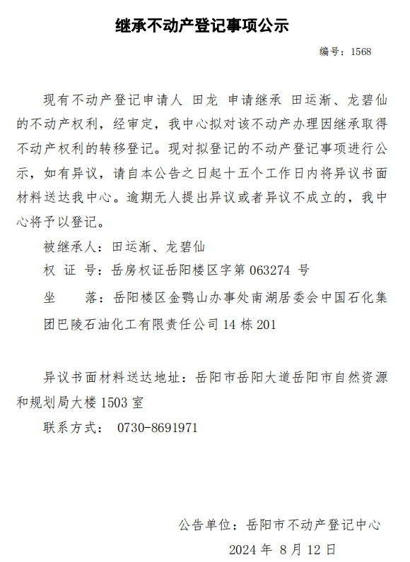 继承不动产登记公示 编号:田龙(1568)