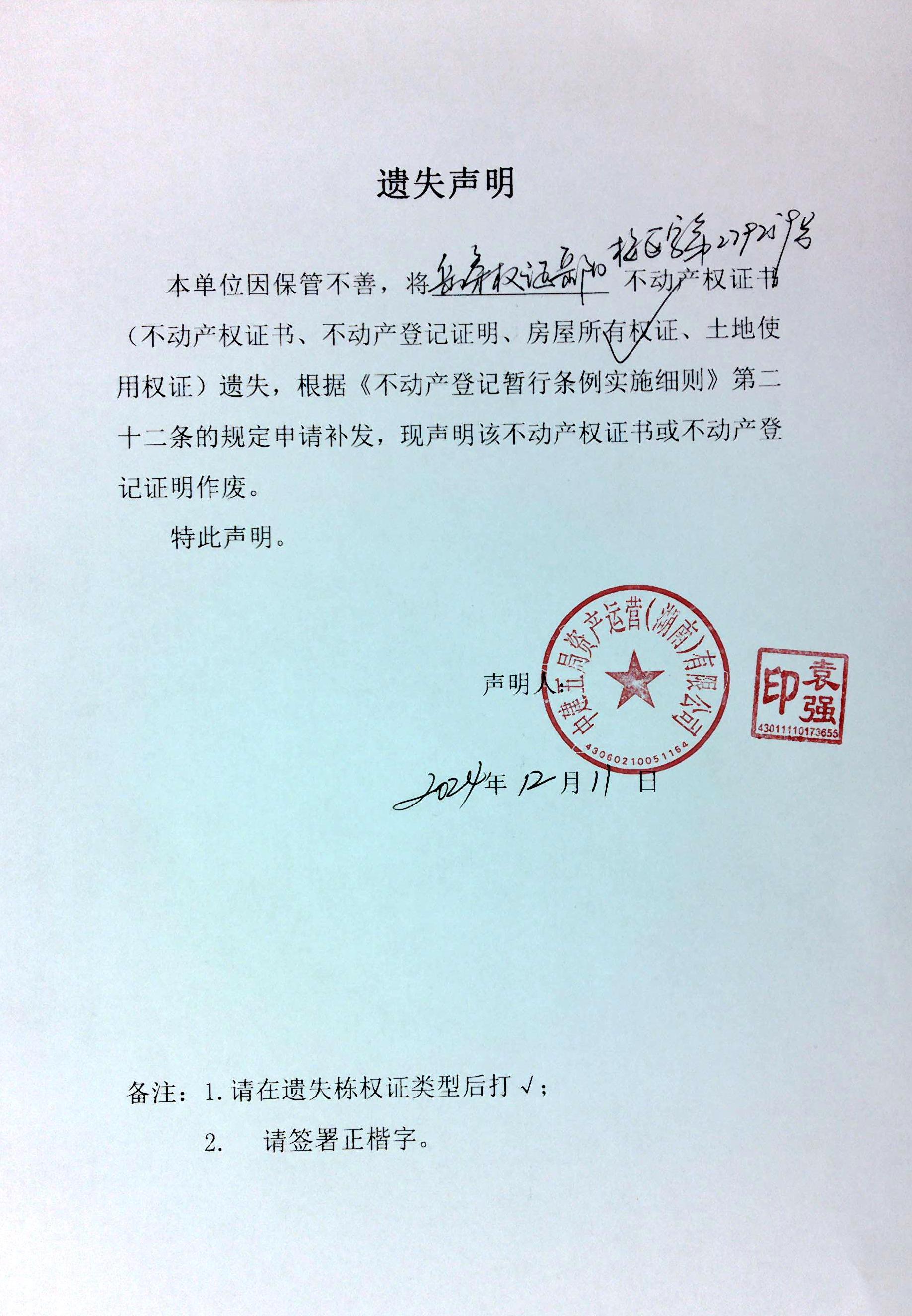 遗失声明[中建五局资产运营(湖南)有限公司]2