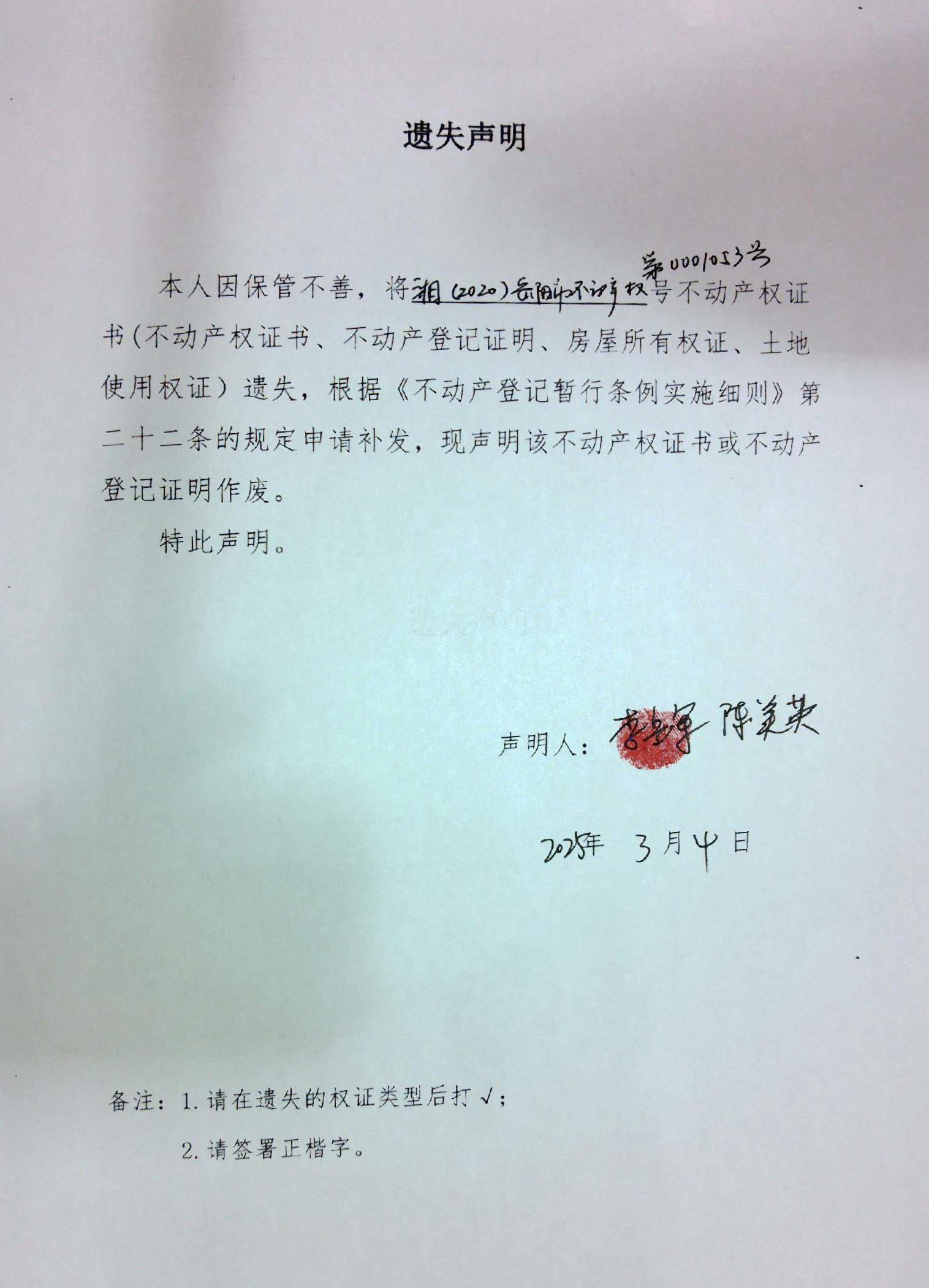 遗失声明(李岳军、陈美英)
